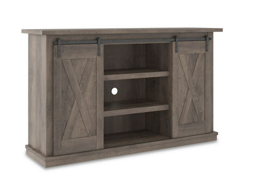 With its replicated weathered oak finish, crossbuck details and authentic charm, this TV stand is right in tune with your relaxed approach to high style. Beautifully made to accommodate your media equipment, it’s well equipped with adjustable shelving, cutouts for wire management and, of course, a pair of sliding barn doors you can center or place to the side. What a mastery in modern farmhouse living.